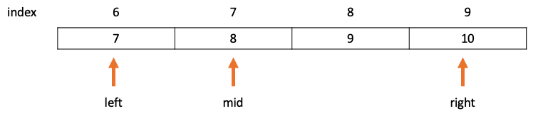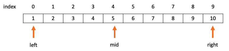 - 탐색을 위해 배열의 인덱스를 저장하는 left, right 포인터로 범위를 지정하고 해당 포인터들을 이용해 중앙 인덱스 값인 mid를 구한다.